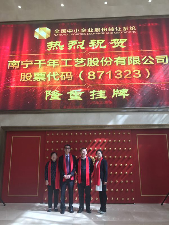 2017年5月5日,在北京金融街金陽大廈內(nèi),隨著開市寶鐘的敲響,南寧千年工藝股份有限公司(企業(yè)簡(jiǎn)稱:千年工藝,股份代碼:871323)在全國(guó)中小企業(yè)股份轉(zhuǎn)讓系統(tǒng)成功掛牌上市,成為廣西首家正式登陸新三板資本市場(chǎng)的工藝制造企業(yè),這是總公司在發(fā)展進(jìn)程中的一個(gè)重大里程碑!